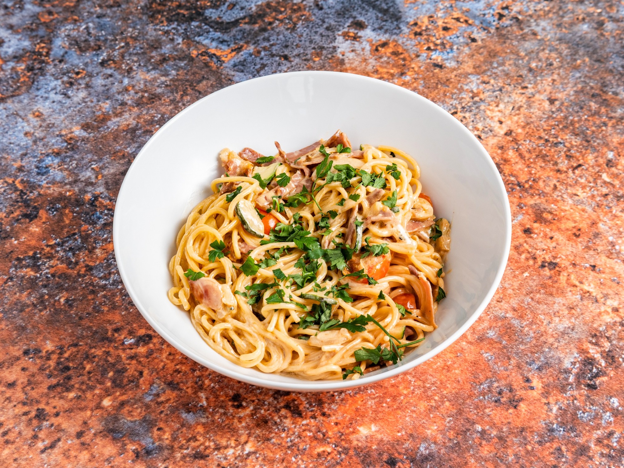 Sos śmietanowy, kurczak, brokuł, czosnek, cebula, pietruszka
